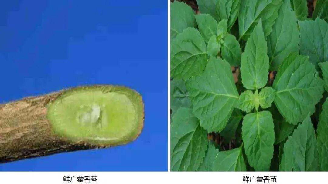 廣藿香的中藥鑒定學:第一,廣藿香干品:莖方柱形而直,常有對生的分枝,四面平坦或凹入成寬溝,長30~90cm,直徑0.2~1cm;表面綠色或黃綠色;質脆易折斷,斷面白色,髓部中空。葉對生,葉片較薄,多皺縮或破碎,完整的葉片濕潤展開后呈卵形或長卵形,長2~8cm,寬1~5cm;上表面深綠色,先端尖銳或短漸尖,基部圓形或心形,邊緣有鈍圓或鋸齒;葉柄長1~4cm。穗狀輪傘花序頂生。氣香而特異,味淡而微涼。全長約30cm~60cm,多分枝全長約30cm~60cm,多分枝;第二,廣藿香鮮品:①全長約30cm~60cm,多分枝。②嫩莖略呈方柱形,枝條稍曲折,直徑0.2cm~0.7cm,表面被柔毛,質脆易折斷,斷面有髓,老莖近圓柱形,直徑1cm~1.3cm,被灰褐色栓皮,質地堅實,不易折斷。③葉對生,下部常脫落,葉片皺縮成團,展平后呈卵形或橢圓形,長4cm~9cm,寬3cm~7cm,先端短尖或鈍圓,基部楔形或近心形,邊緣具不整齊鈍鋸齒,兩面均被茸毛。④香氣特異,味微苦。