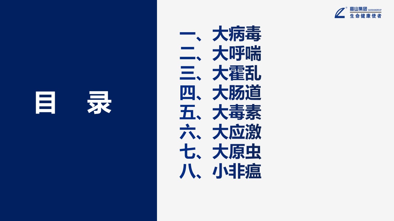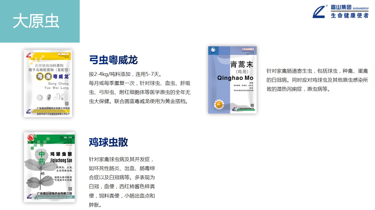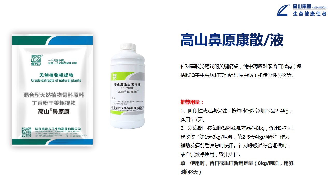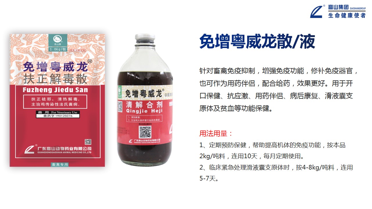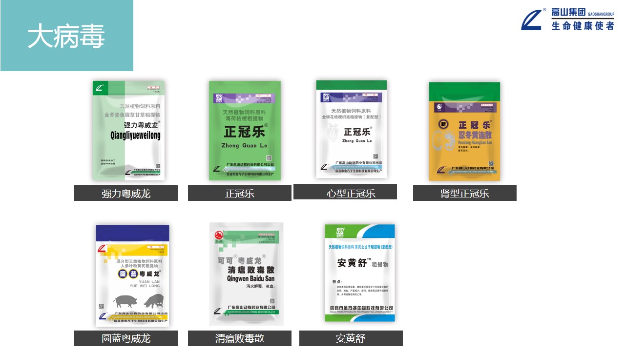 前言:在畜禽生產中,病毒已普遍存在,或兩種,或三種,或更多。而且,因為病毒不斷變異,還因為不同毒株、不同亞型和不同血清型的交叉保護不足,更是因為在臨床生產中,又是以多種病毒混感為主。當然,影響生產的主要臨床證候是某一種病毒為主。除了病毒,還要關注細菌、內毒素、原蟲等問題。在畜禽生產中,以多種病毒混感以外,單一病毒或多種病毒與多種細菌混感更為普遍。而內毒素問題,原蟲問題,還有水禽痛風問題以及種源的垂直傳播疾病問題,特別是免疫缺陷及免疫障礙問題等,更是需要關注,并且已經是客觀存在的事實,僅靠疫苗或非中藥防控措施已顯欠缺。中醫中藥,以證論治。高山中藥,以“抗病毒+抗細菌+清除內毒素+驅醫學原蟲”作為其經典的組合法則,從動物機體的整體調理出發,針對瘟毒邪疫諸證,機體內毒素和體內組織的各種寄生蟲,以幫助解除機體亞健康,減少疾病發生,做好中藥基礎保健,機體更健康,幫助提高生產潛能的目的。一個高山中藥產品是一個證候的中藥應用方案。針對以上問題,倡導并把握好中藥開口保健開始、聯合兩種及兩種以上用藥、首日及重證加量、前置預防、加藥引煎煮、用足藥量及用夠時間等原則,高山小編為大家整理了2022年主推的對應經典產品,以供參考。