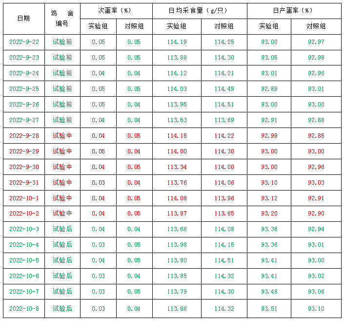 摘要:湖南某禽業(yè)有限公司,現(xiàn)有品種海蘭褐蛋雞約15萬(wàn)存欄,選取250日齡的蛋雞兩棟舍共10萬(wàn)羽做試驗(yàn)。此欄蛋雞精神狀況尚好,沒(méi)有明顯的疾病癥狀,采食量正常,產(chǎn)蛋率93%,次蛋率比較高,約為0.5%,兩棟舍蛋雞的次蛋表現(xiàn)最多為軟殼蛋、水紋蛋,推薦使用中藥蛋雞寶進(jìn)行對(duì)比試驗(yàn),蛋雞寶的用法與用量按2kg/噸料使用。本實(shí)驗(yàn)旨在研究高山金方子產(chǎn)品“蛋雞寶粗提物”對(duì)蛋雞軟殼蛋、水紋蛋等次蛋現(xiàn)象的應(yīng)用效果評(píng)價(jià),本報(bào)告數(shù)據(jù)均為原始真實(shí)數(shù)據(jù),以供大家參考。