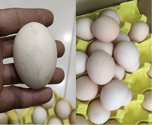 2、水紋蛋:特點(diǎn)是表面粗糙,呈現(xiàn)紋路皺紋在蛋殼表面上。原因可能是遺傳,新城疫或者支氣管炎,使用抗生素過(guò)度,鈣磷過(guò)量不平衡,銅缺乏,或老齡蛋雞等均易發(fā)生。