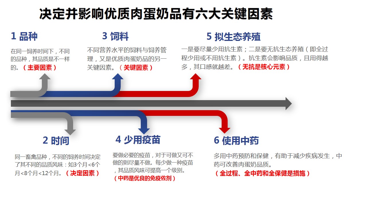 四、蛋品數量與質量直接影響養殖效益,而決定并影響優質肉蛋奶有六大關鍵因素:品種(主要)、時間(影響)、飼料(關鍵)、少用疫苗(中藥)、擬生態養殖(核心元素)、使用中藥(措施)。