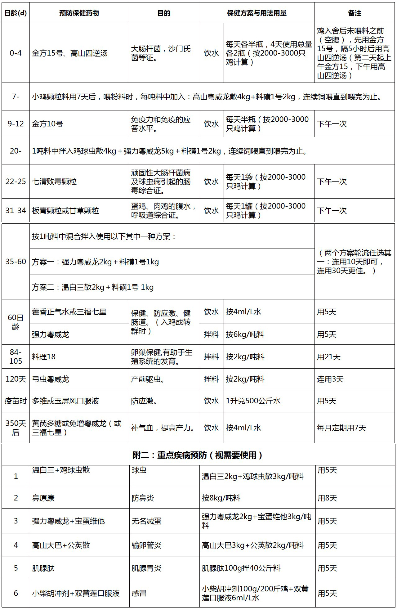 全過程無抗蛋雞養殖方案包括:一,0-60日齡超前中藥保健方案;二,從60日齡至600日齡淘汰東東蛋全過程無抗中藥保健方案。