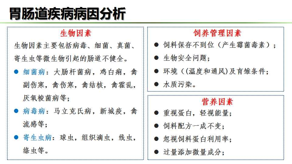 《禽病十問》,是由十四屆全國人大代表、華南農(nóng)業(yè)大學科學研究院院長、新農(nóng)村發(fā)展研究院常務副院長、鄉(xiāng)村振興研究院常務副院長,教授,博士生導師,廣東省高等學?!爸榻瓕W者”特聘教授、廣東省第十二次黨代會代表、廣東省家禽產(chǎn)業(yè)技術(shù)體系首席專家,謝青梅教授于2024年1月4日高山營銷大會上所作的主題報告,報告指出,當前的禽病臨床情況復雜,呈多病原共感染和多病因影響,她分別從1肝臟、2糞便異常、3呼吸道、4胃腸道、5蛋品質(zhì)異常、6骨骼、7皮膚、8抗生素殘留、9頭面部異常、10腎臟等十種病證分別進行了詳細的病因分析,分享了禽疾病的防治措施除了要做好生物安全、飼養(yǎng)管理、營養(yǎng)補給和疫苗免疫外,要科學使用高山中藥做好預防和保健,以減抗和全過程無抗養(yǎng)殖技術(shù)支撐,以實現(xiàn)優(yōu)質(zhì)肉蛋奶品為導向,以證論治和論防,是應對和解決禽疾病的多病原共感染和多病因影響的好辦法。