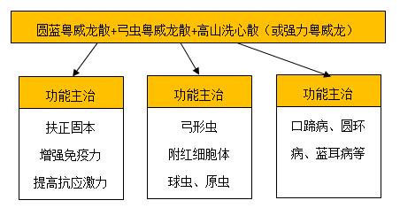 二、針對畜抗病毒性疫證,如口蹄病、豬瘟、偽狂犬、圓環病和藍耳病等,可選用如下黃金組合進行定期保健防控,幫助解除亞健康,提高生產性能。