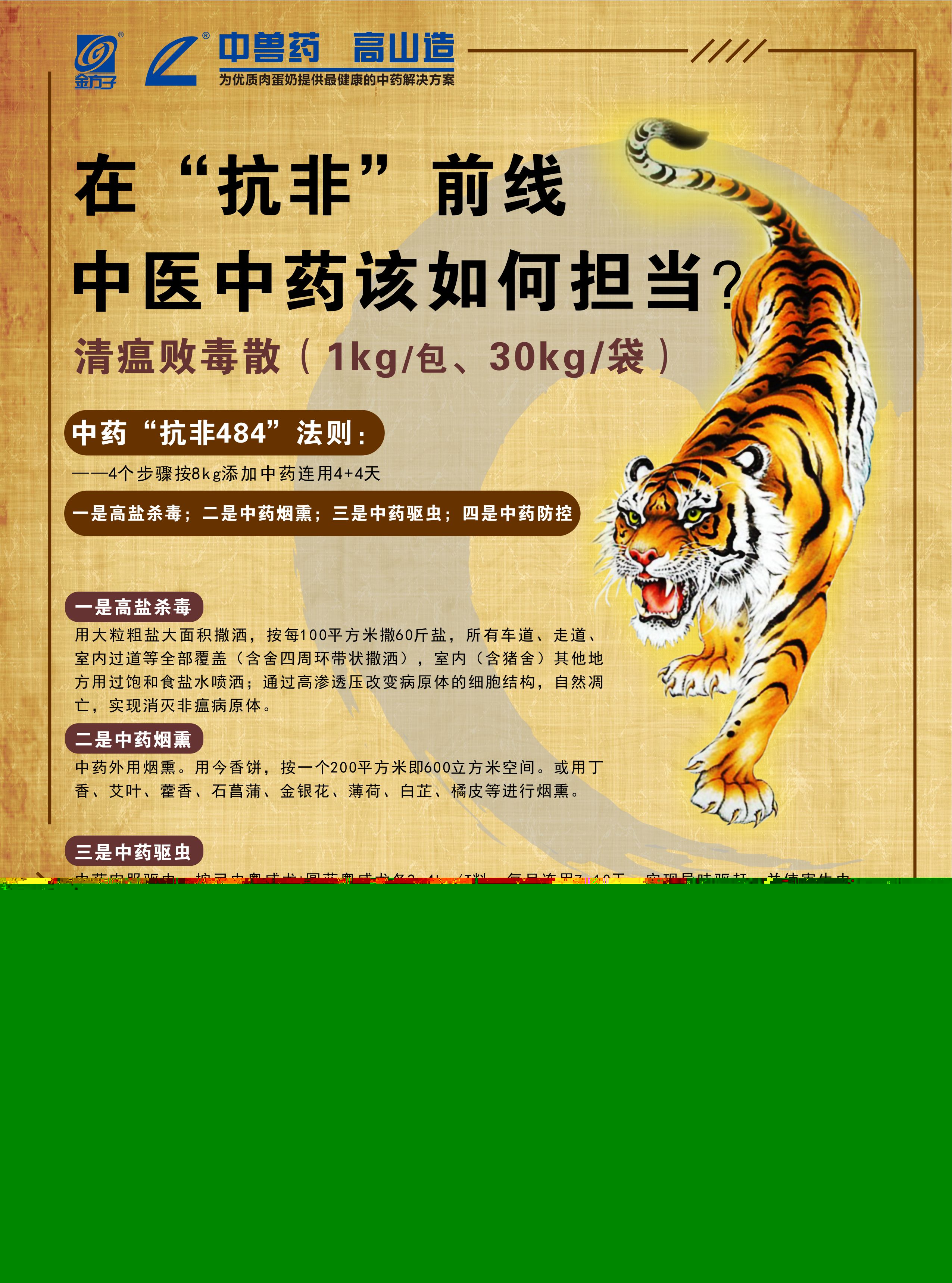 清瘟敗毒散,按4-8kg/噸料,每個(gè)月連用10天,首次或重癥者加量;考慮非瘟潛伏期19天可適當(dāng)延長(zhǎng)使用時(shí)間到15天。具有強(qiáng)心、涼血、止血、消腫、消喘、退熱,排毒、通膽,殺蟲等,更對(duì)癥,更嚴(yán)謹(jǐn),更科學(xué)。