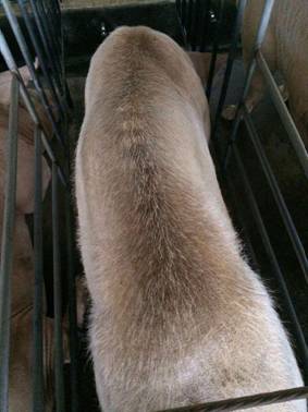 案例:廣東催某某豬場,2015年1月8日,母豬存欄200頭,癥狀:母豬體外皮毛粗亂,毛孔針尖樣出血,黑斑明顯。