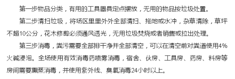 1、場區:整理整頓→清掃垃圾→消毒