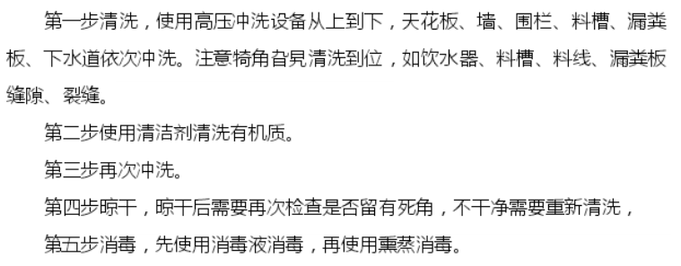 2、豬舍:清洗→清潔劑→沖洗→晾干→消毒