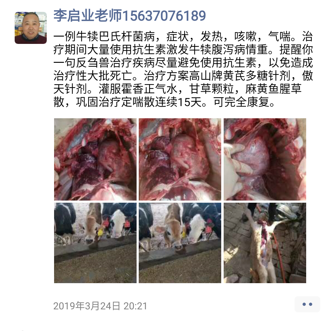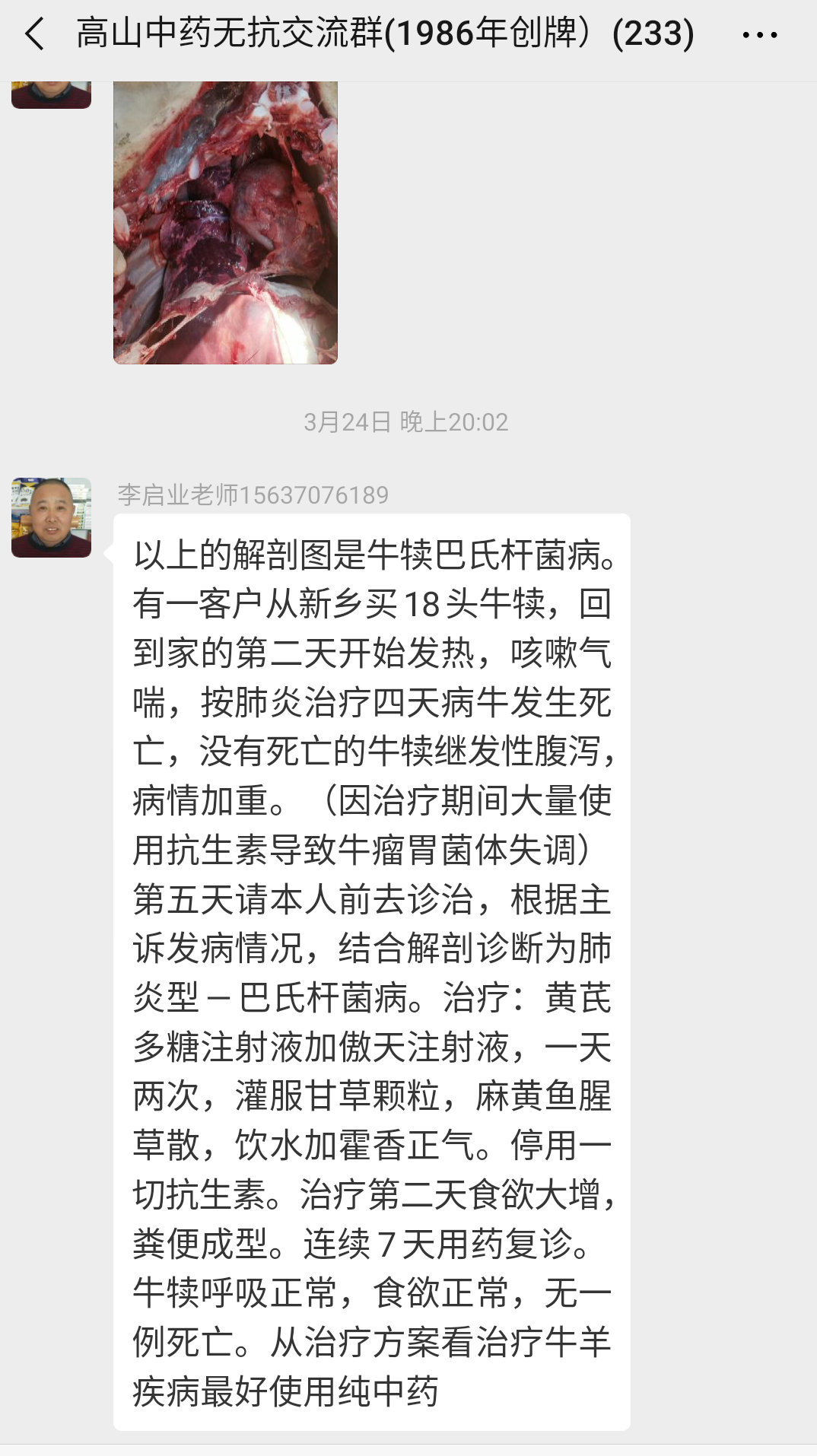 案例:有一客戶從新鄉買18頭牛犢,回到家的第二天開始發熱,咳嗽氣喘,按肺炎治療四天病牛發生死亡,沒有死亡的牛犢繼發性腹瀉,病情加重。(因治療期間大量使用抗生素導致牛瘤胃菌體失調)第五天請本人前去診治,根據主訴發病情況,結合解剖診斷為肺炎型―巴氏桿菌病。治療:黃芪多糖注射液加傲天注射液,一天兩次,灌服甘草顆粒,麻黃魚腥草散,飲水加藿香正氣口服液。停用一切抗生素。治療第二天食欲大增,糞便成型。連續7天用藥復診。牛犢呼吸正常,食欲正常,無一例死亡。從治療方案看治療牛羊疾病是使用純中藥。