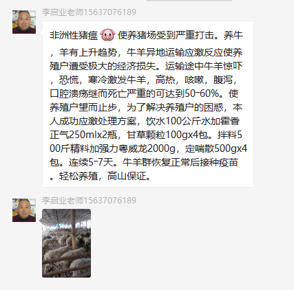 針對牛羊運輸強應激綜合征,李老師有很成功的處理方案:飲水,100公斤水添加藿香正氣口服液(250mlx2瓶)和甘草顆粒(100gx4包)。拌料,500斤精料添加強力粵威龍散(2000g)和定喘散(500gx4包)。連用5―7天。牛羊群恢復正常后接種疫苗。
