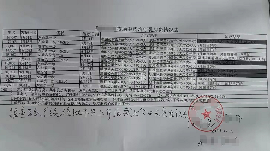 鑒于**生牧場近期奶牛臨床型乳房炎發病率增高(最高近7%)且復發率高的問題,經技術管理部推薦,牧場同意用廣東高山中獸藥公英散和魚腥草注射液進行乳房炎治療試驗。