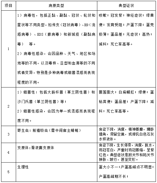 2.2蛋殼異常:EDS(無殼蛋)、前殖吸蟲(紙樣薄殼)、新城疫(軟殼蛋)、滑液囊支原體(沙殼蛋)、大腸桿菌(粘糞蛋)。